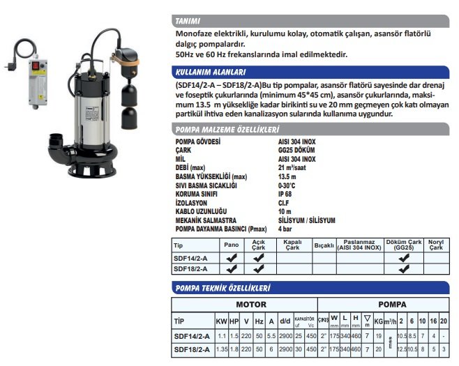 Sumak SDF 14/2-A Döküm Göv. Asansör Flatörlü Foseptik Pompası 1.5 HP Monofaze