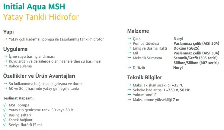 WILO Initial Aqua MSH serisi hidroforlar uygun fiyatlı hidrofor serisidir. İleri ALMAN teknolojisi ile İtalya'da üretilen bu pompalardan üretilir; bağ bahçe sulamada, ev ve iş yerlerinde ve de sanayide, kısacası basınçlı suyun gerektiği her yerde kullanılabilir. Su tüketiminin başladığı anda hidrofor otomatik olarak devreye girer ve su tüketimi bittiğinde otomatik olarak durur. Hidrofor pompası yatay çok kademeli sessiz tip bir pompadır. Pompa gövdesi paslanmaz çelik, pompa emme ve basma ağzı dökümdür. Sağlam ve uzun ömürlüdür. Pompa, difüzör ve çarkları plastik malzemeden üretilmiştir.